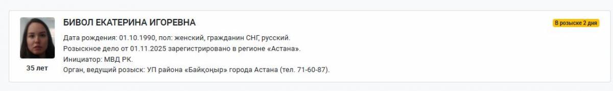 Жарияланған деректерге сәйкес, Екатерина Бивол Қазақстан Республикасы Ішкі істер министрлігінің бастамасымен іздеу жарияланғандар тізіміне енгізілген. Іс 2025 жылдың 1 қарашасында Астанада тіркелген. Іздеуді елордадағы Байқоңыр ауданының полиция басқармасы жүргізіп жатыр.