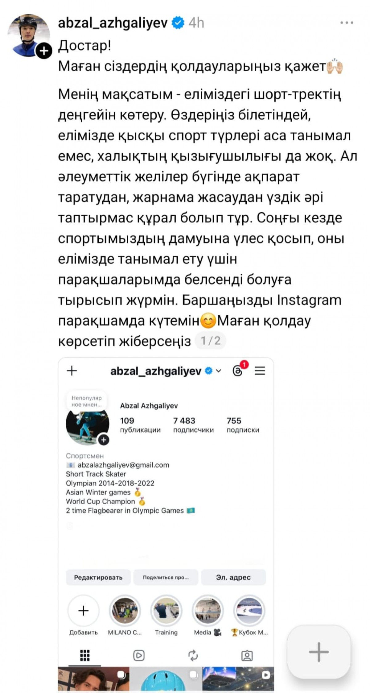 "Достар! Маған сіздердің қолдауларыңыз қажет. Менің мақсатым - еліміздегі шорт-тректің деңгейін көтеру. Өздеріңіз білетіндей, елімізде қысқы спорт түрлері аса танымал емес, халықтың қызығушылығы да жоқ. Ал әлеуметтік желілер бүгінде ақпарат таратудан, жарнама жасаудан үздік әрі таптырмас құрал болып тұр. Соңғы кезде спортымыздың дамуына үлес қосып, оны елімізде танымал ету үшін парақшаларымда белсенді болуға тырысып жүрмін. Баршаңызды Instagram парақшамда күтемін. Маған қолдау көрсетіп жіберсеңіз", - деп жазды Абзал Әжіғалиев.