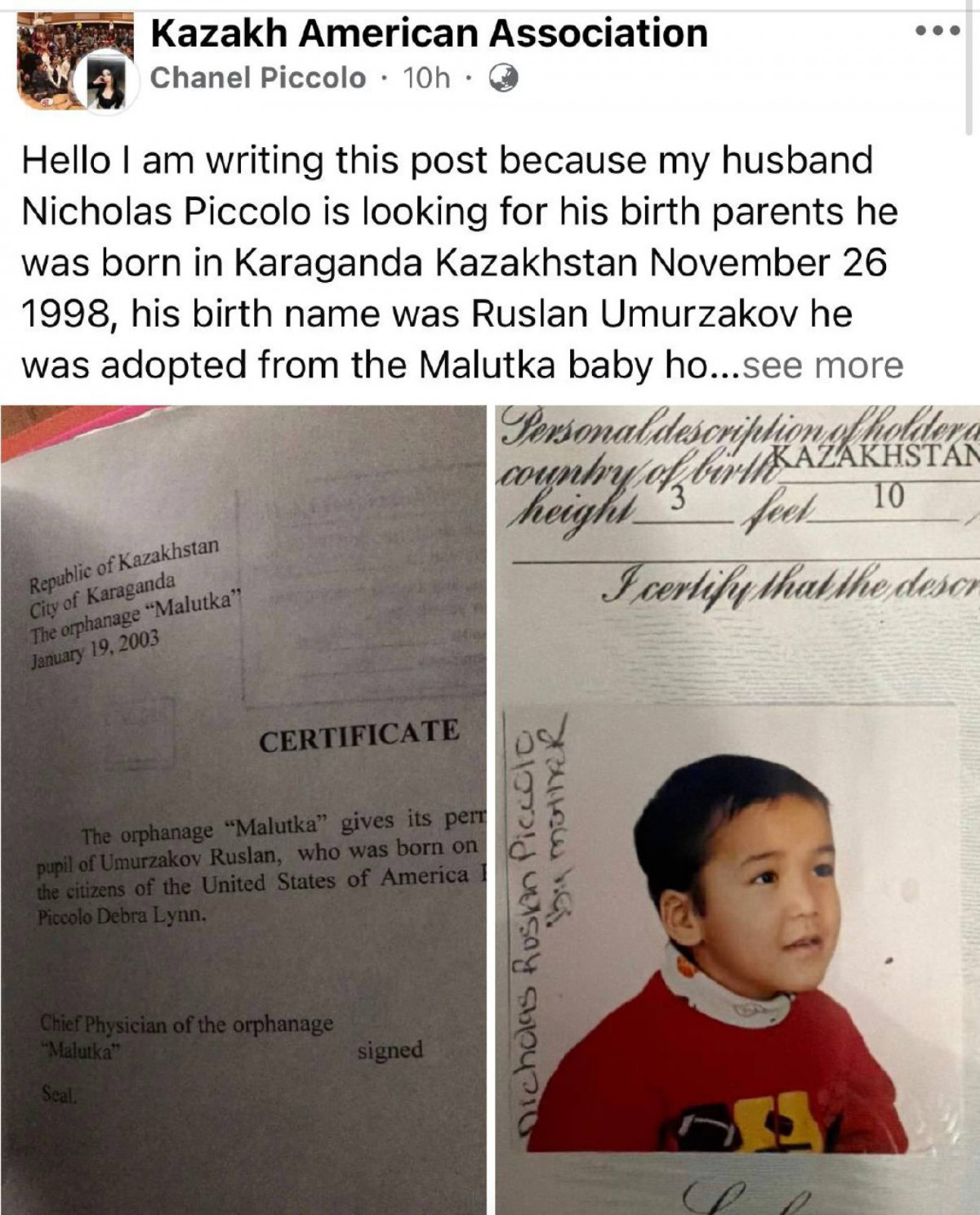 Америкалық Николас Пикколо есімді азамат Қарағандыдан өзінің биологиялық әке-шешесін іздейді. Бұл хабарландыруды оның келіншегі Facebook желісіндегі Kazakh American Association парақшасында жариялаған, деп хабарлайды turkystan.kz.