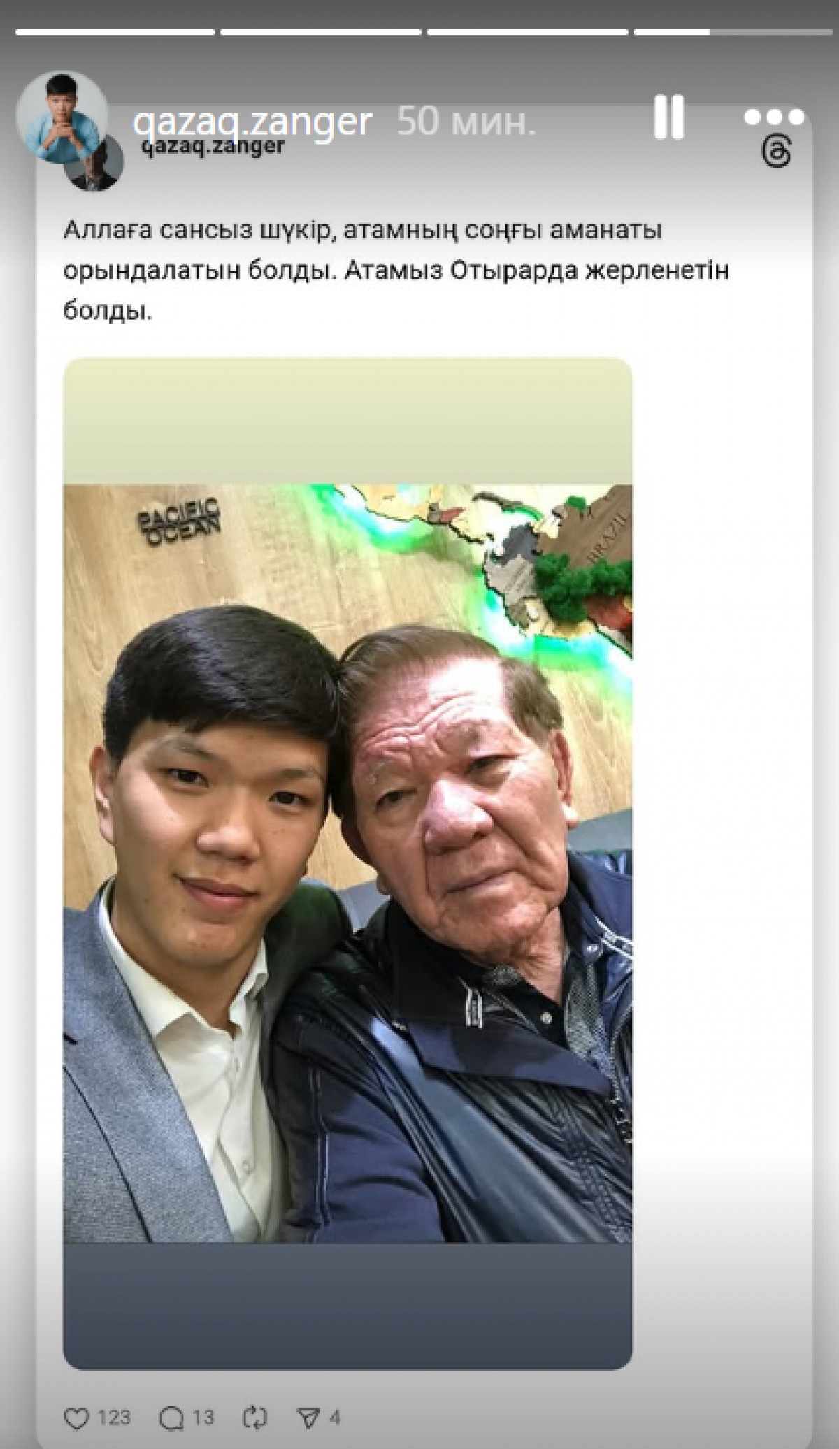«Аллаға сансыз шүкір, атамның соңғы аманаты орындалатын болды. Атамыз Отырарда жерленеді», - деп жазды ол.